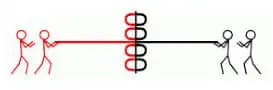 Un esempio esplicativo di come lavorano i 2 fili nella cucitura eseguita da una macchina per cucire potrebbe essere il tiro alla fune.
