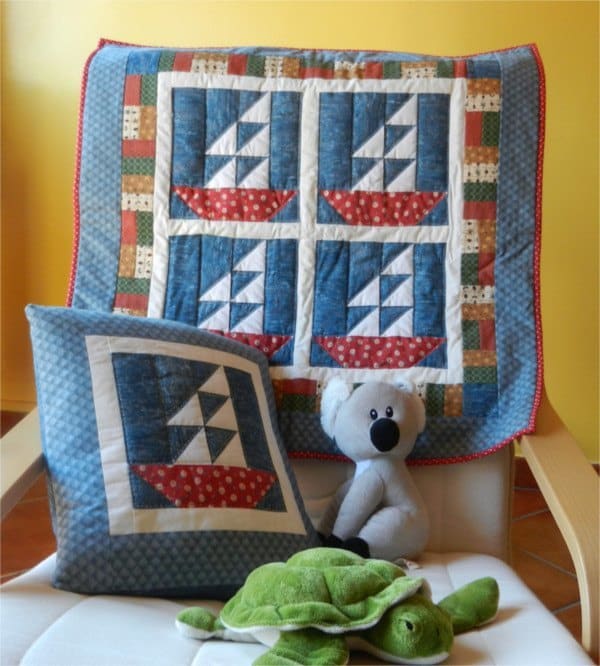 Le barchette a vela sono perfette per abbellire la camera dei bambini o se volete pensare in grande, potreste farne un quilt da mettere sul vostro divano. La tecnica che vi proponiamo per realizzare i triangoli è facilissima e veloce da effettuare. Composizione di un quilt Il quilt è formato da una parte superiore, patchwork o top, una parte interna, il batting, formata dall’imbottitura e una parte posteriore, il backing. Una volta fatto il quilt, si eseguono sul patchwork le impunture o quilting, che hanno lo scopo di tenere insieme i tre strati (stoffa e imbottitura) e rinforzare le cuciture, oltre di abbellirlo con vari disegni. Ogni sezione finita del patchwork si chiama blocco. É importante la stiratura effettuata ogni volta che si cuce un pezzo unito a un altro. Attenzione! Il margine per la cucitura deve essere sempre di 6 millimetri e gli orli devono essere stirati insieme nella direzione della stoffa di colore più scuro, se non specificato in maniera diversa. L’accuratezza del taglio, delle cuciture e della stiratura sono fondamentali per la riuscita di un buon quilt.