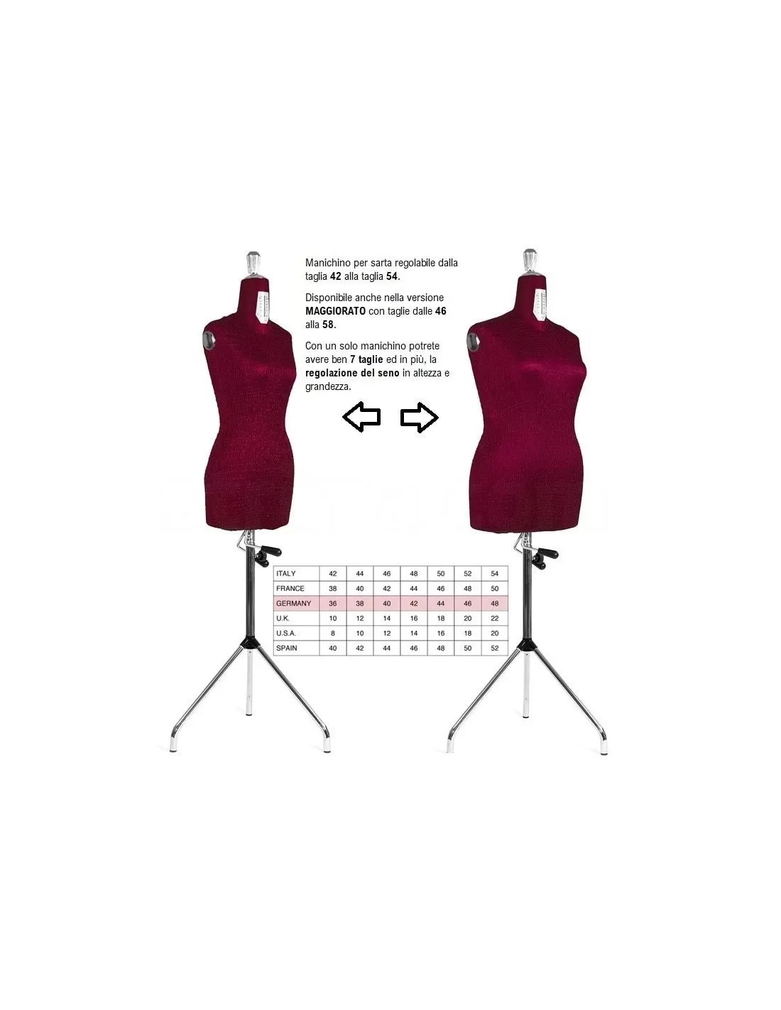 The adjustable dressmaker's mannequin size 42-54 is equipped with a precise mechanism that allows adjustment according to the chosen size in a proportionate way, just turn the knob positioned at the top to obtain the desired size that will be highlighted on the size marker located on the neck of the bust.