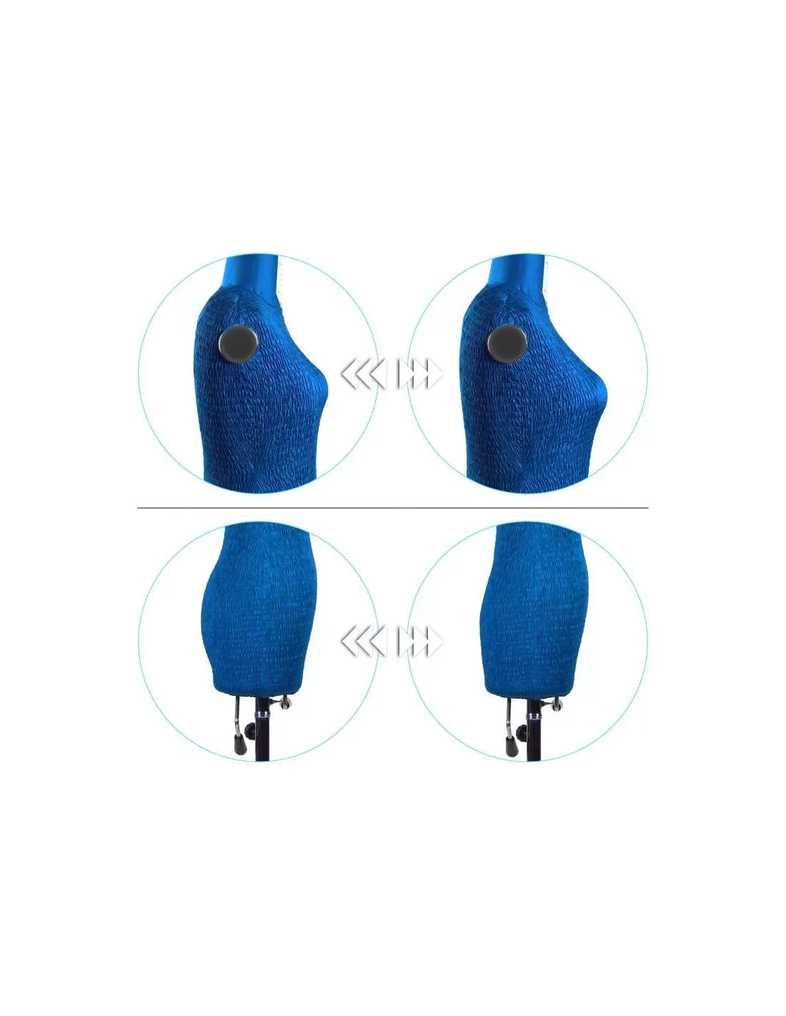 Adjustable dressmaker's mannequin for women covered with resistant stretch fabric that allows the size to be adjusted from 42 to 54 and allows pinning with ease and safety.