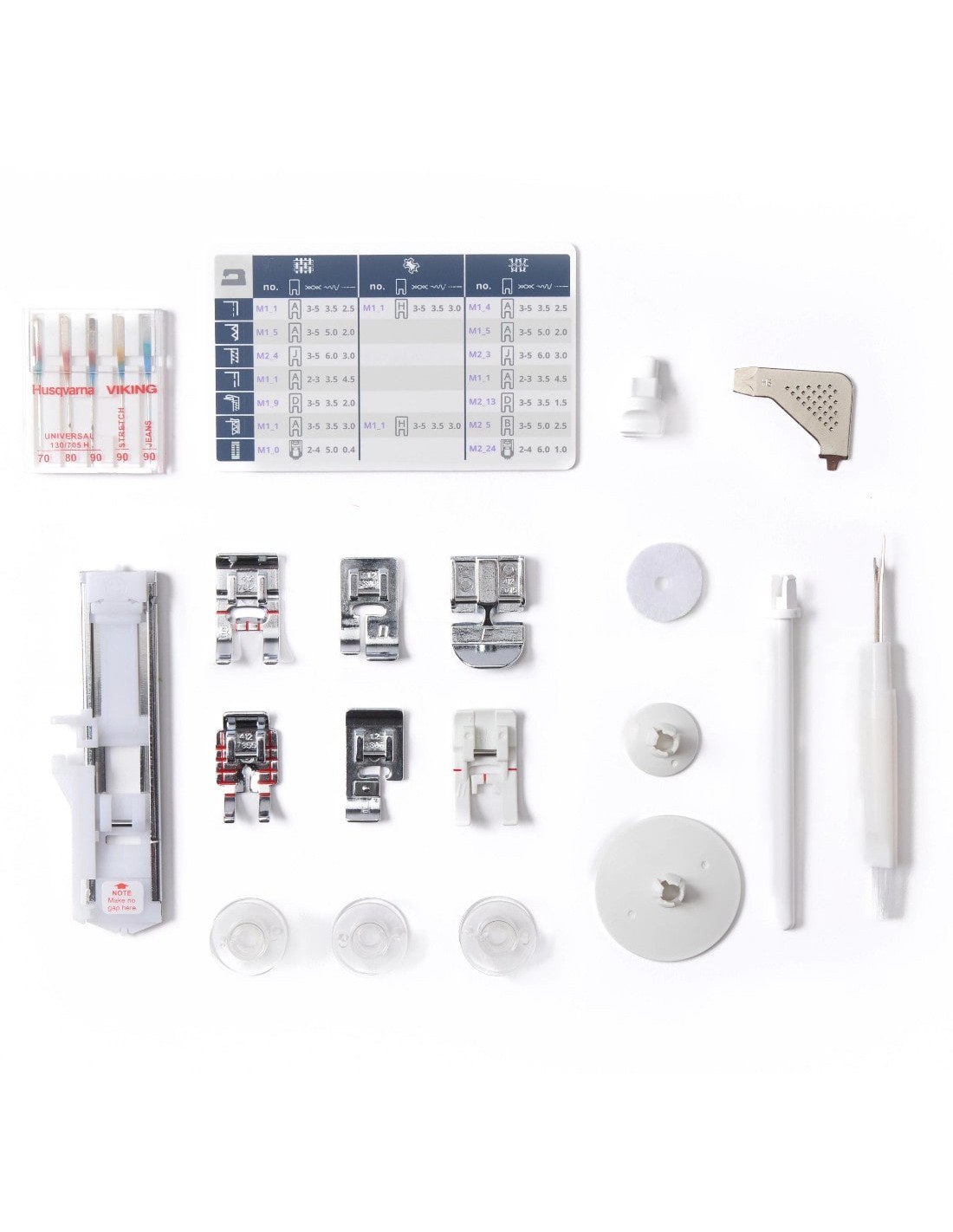 15 needle positions, adjustable thread tension and presser foot pressure, automatic reverse stitch button, mirror stitching, automatic stop, satin stitch extension, LED light, feed-through cancel, and 20 accessories included.