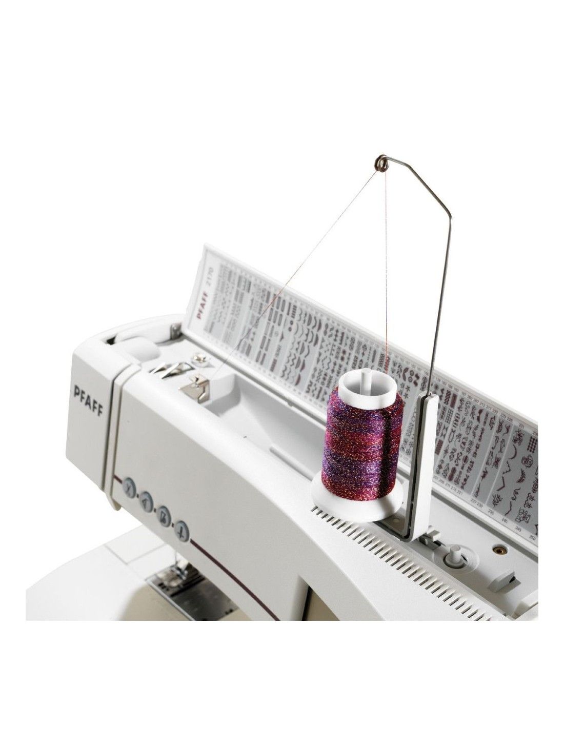The Pfaff Creative Spool Stand is an accessory that makes it easy to use large spools of decorative thread.