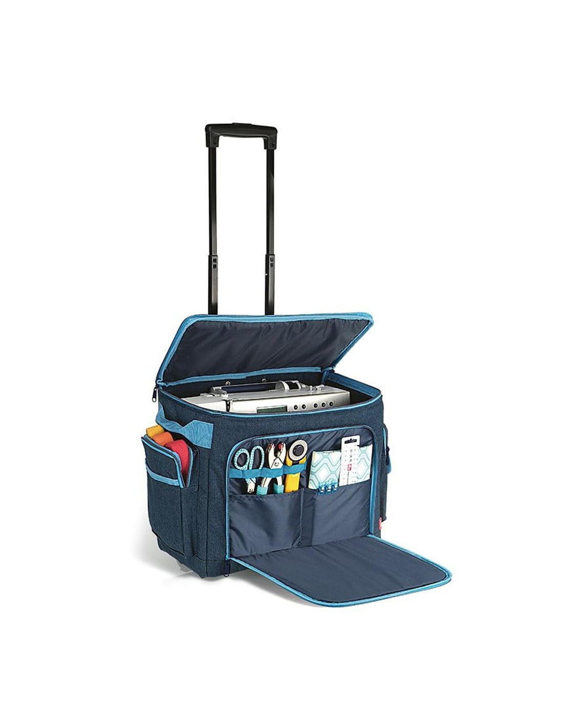 Trolley case for sewing machines made of water-repellent jeans-coloured polyester with the following features: