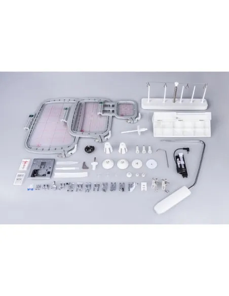 The machine is supplied with 3 hoops (260×160 mm, 180×120 mm and 70×50 mm), embroidery foot, embroidery plate and specific spool basket for excellent tension of the lower thread.</p >