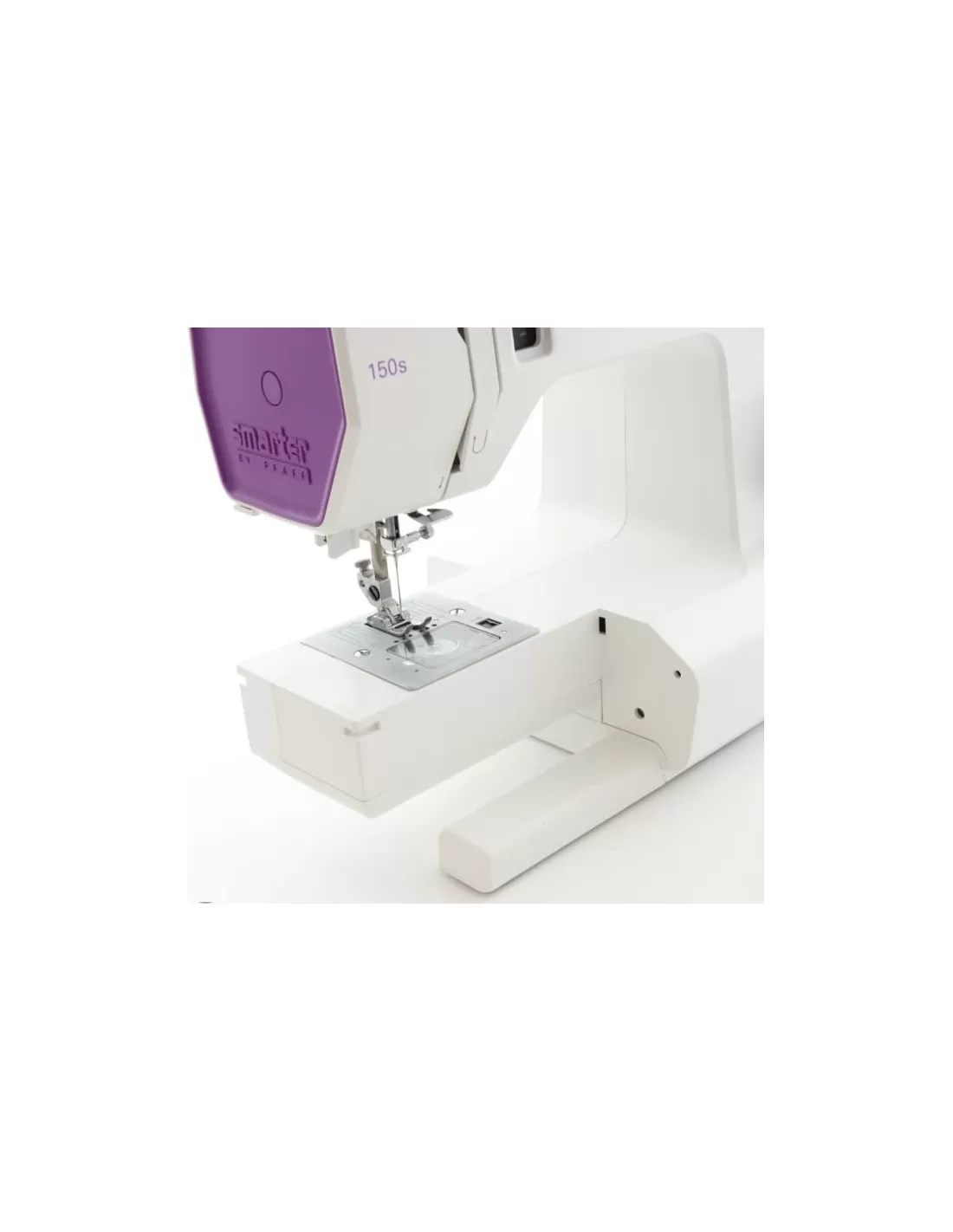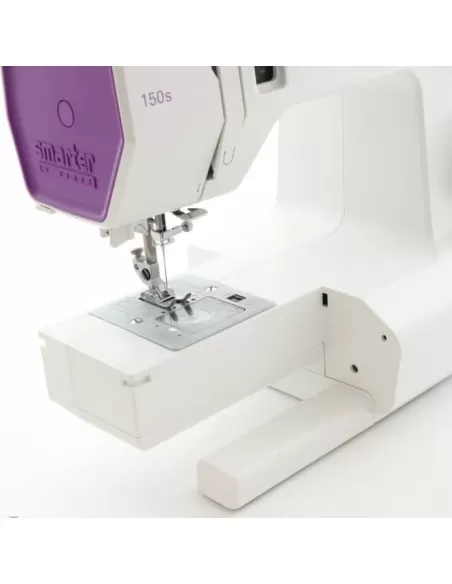 Easy threading, built-in needle threader, jam free rotary hook with top-loading drop-in bobbin, high presser foot height, adjustable presser foot pressure, slim free arm for working on tubular items such as cuffs, trouser legs, necklines and more, adjustable sewing speed and hard cover.