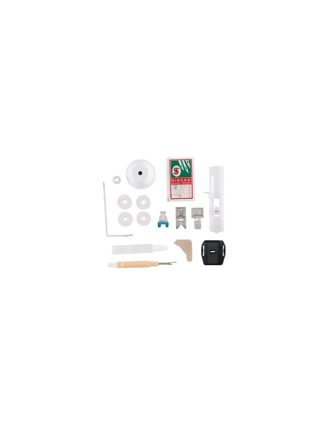 Accessories included: All Purpose Foot, Zipper Foot, Button Hole Foot, Button Sewing Foot, Seam Ripper/Lint Brush, Edge/Quilting Guide, Pack of Needles, Spool Holder, Bobbins, L-Screw Driver, Oil Bottle, Darning Plate and Soft-Sided Cover.