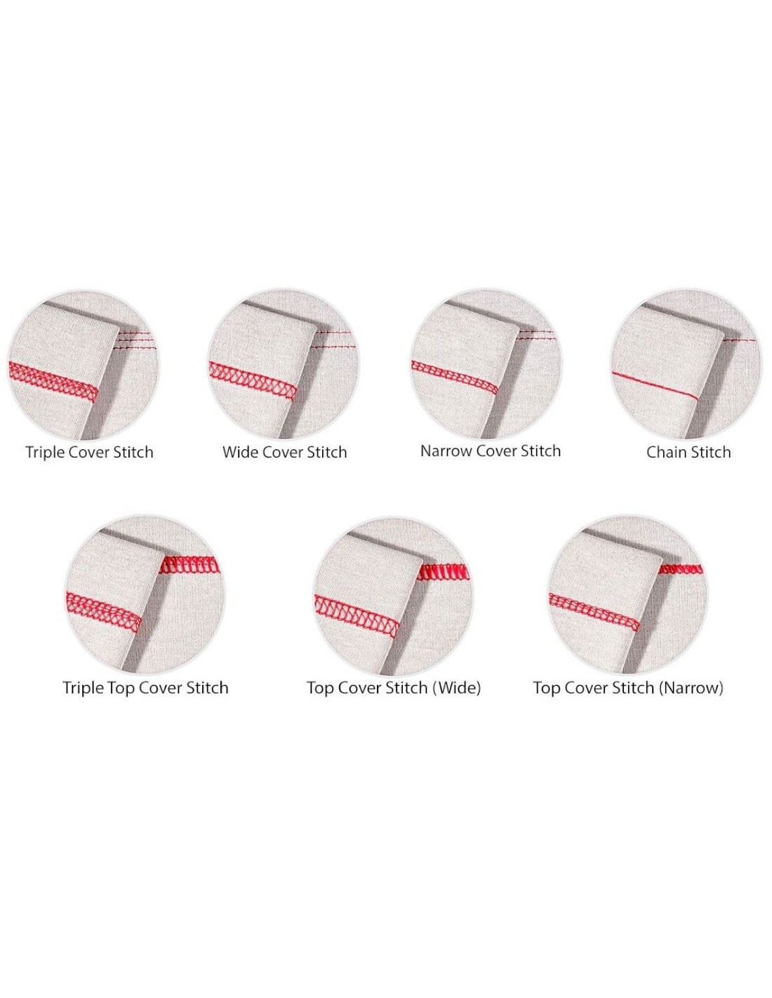 Punto de cobertura superior con 3 agujas y 5 hilos. Ideal para dobladillos, pespuntes, puntos de unión planos y bordes con elástico y cinta