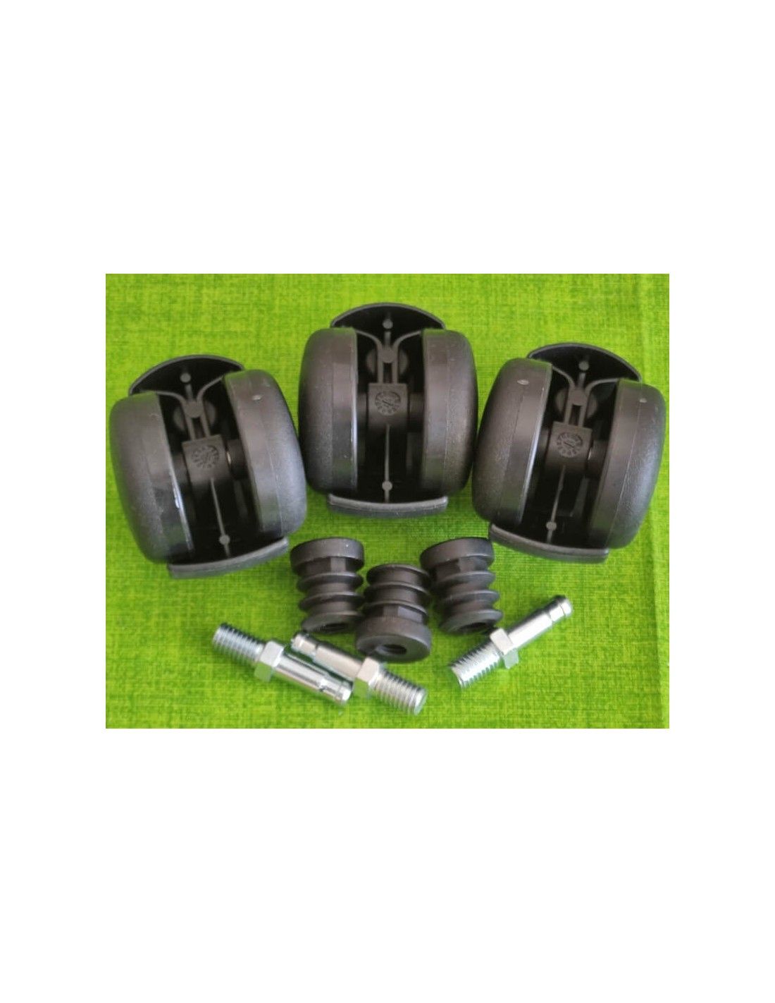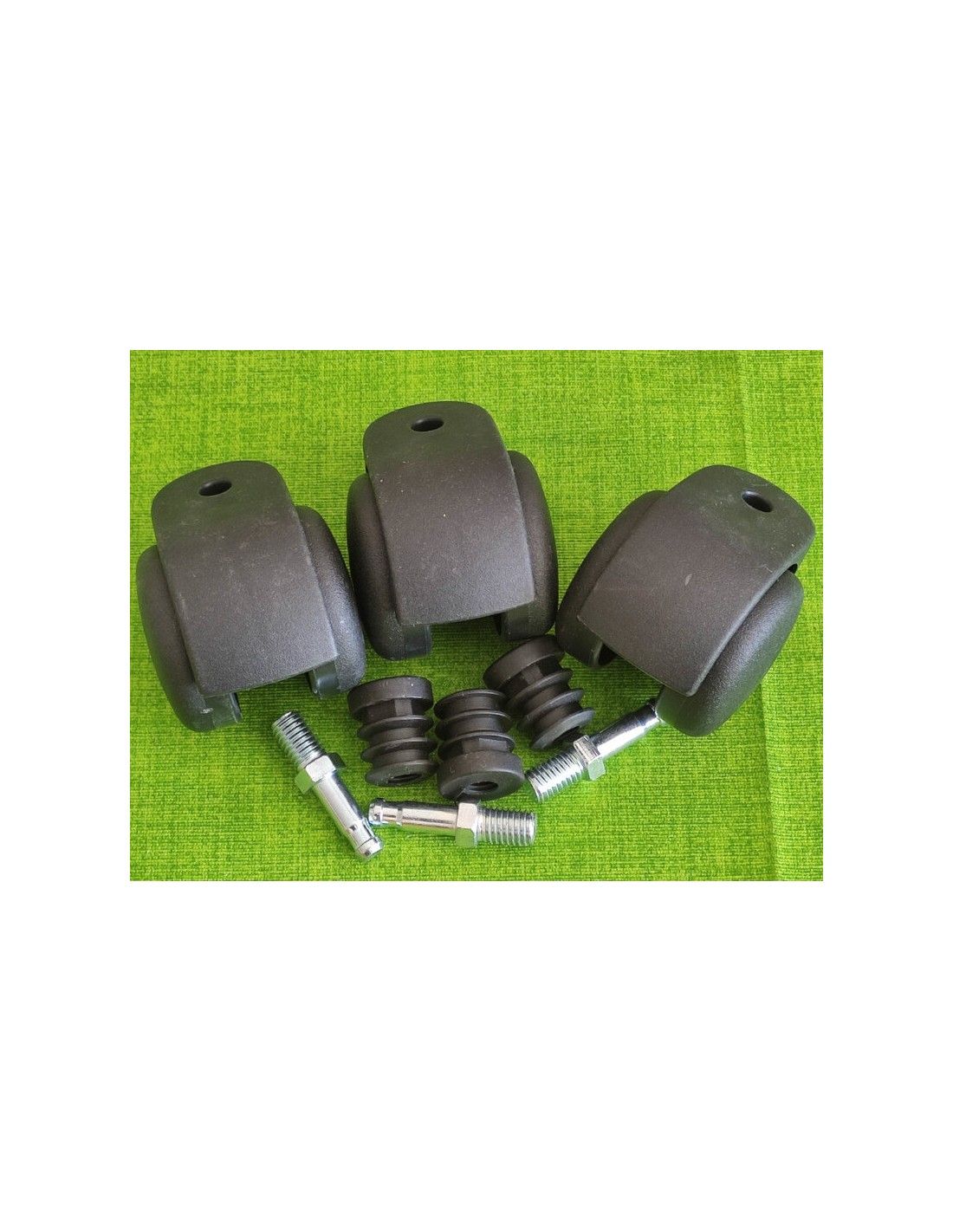 El conjunto se compone de 3 ruedas giratorias con sus correspondientes pasadores y casquillos para la fijación al pedestal del busto de sastre regulable.