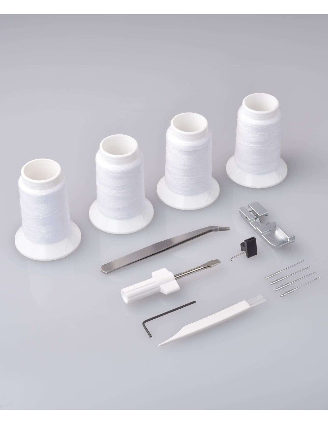 La máquina overlock Tras la prueba para asegurar su perfecto funcionamiento por uno de nuestros técnicos, se dejará roscado con 4 conos blancos para que te sea más fácil en las primeras pruebas.