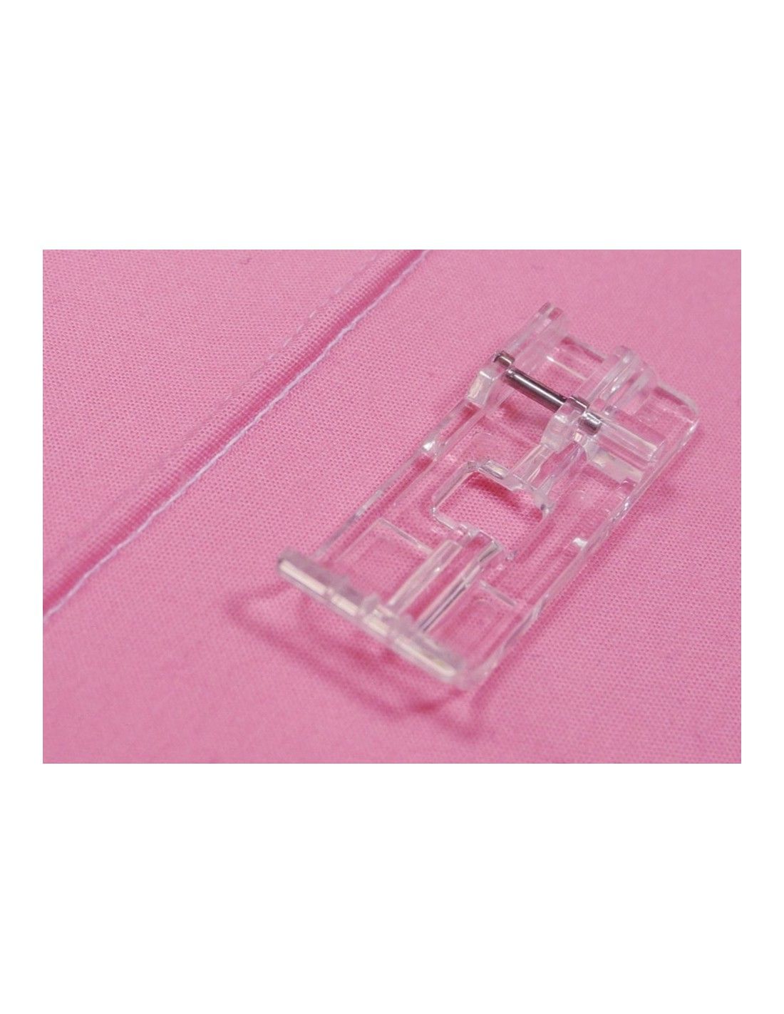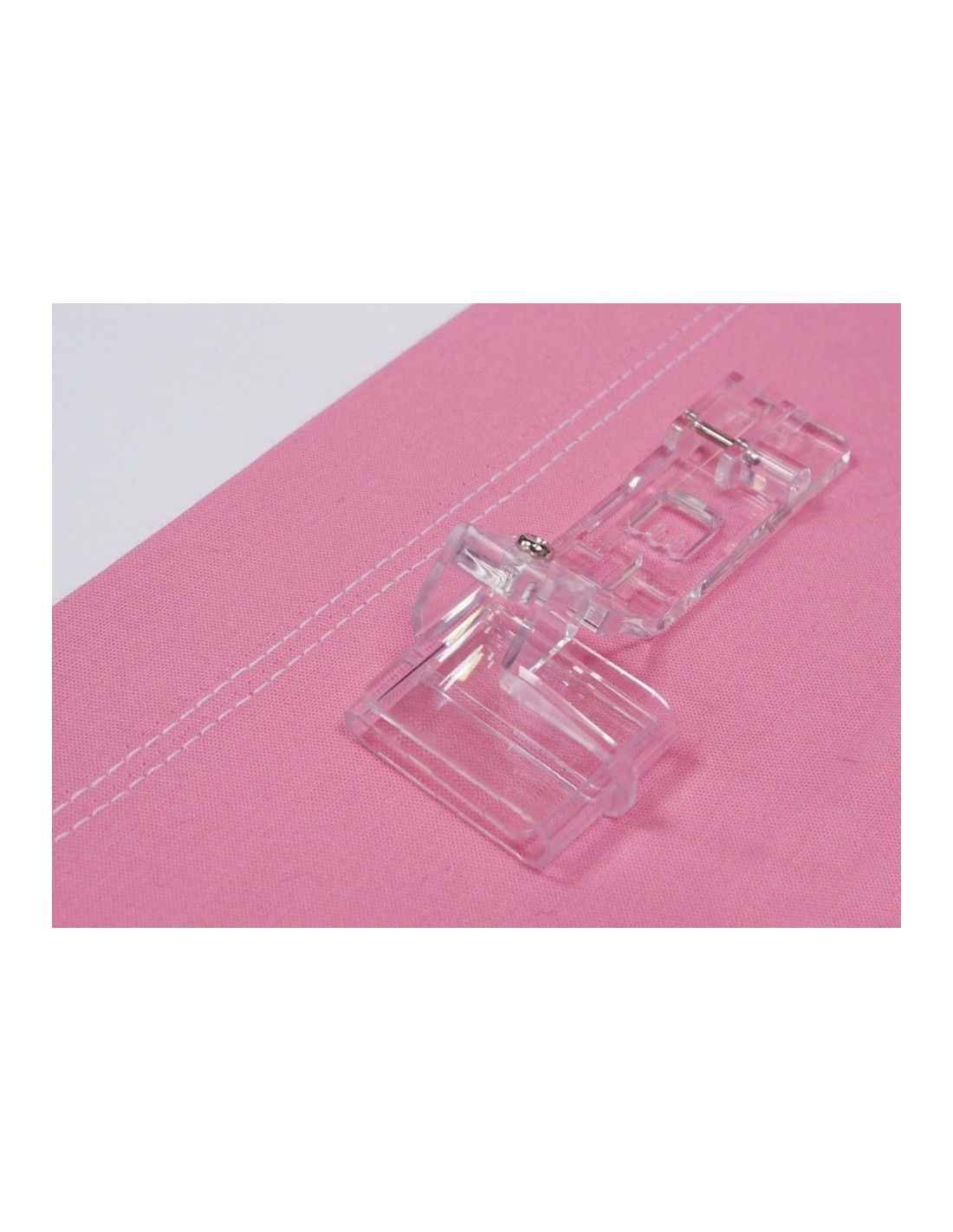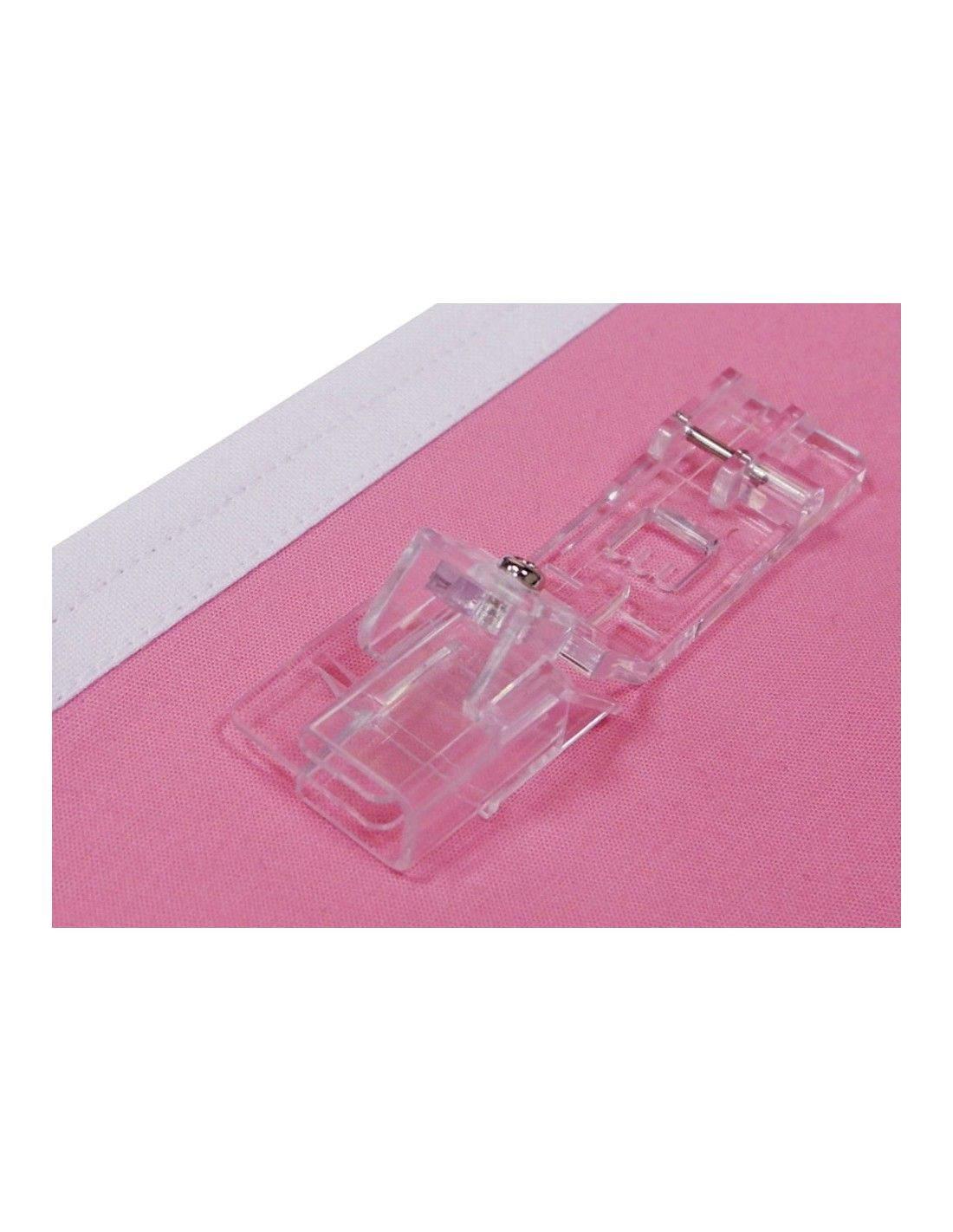 Utilice el pie transparente para aumentar la visibilidad mientras cose, crea bordes decorativos y efectos fabulosos con el pie para encuadernación y plegado de bordes y el prensatelas para cordones de borde plano.
