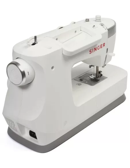 La Singer Elite ME457 parece una elegante máquina de coser. Además de la forma moderna, los elementos plateados en el volante, el cabezal de costura y la base llaman la atención.