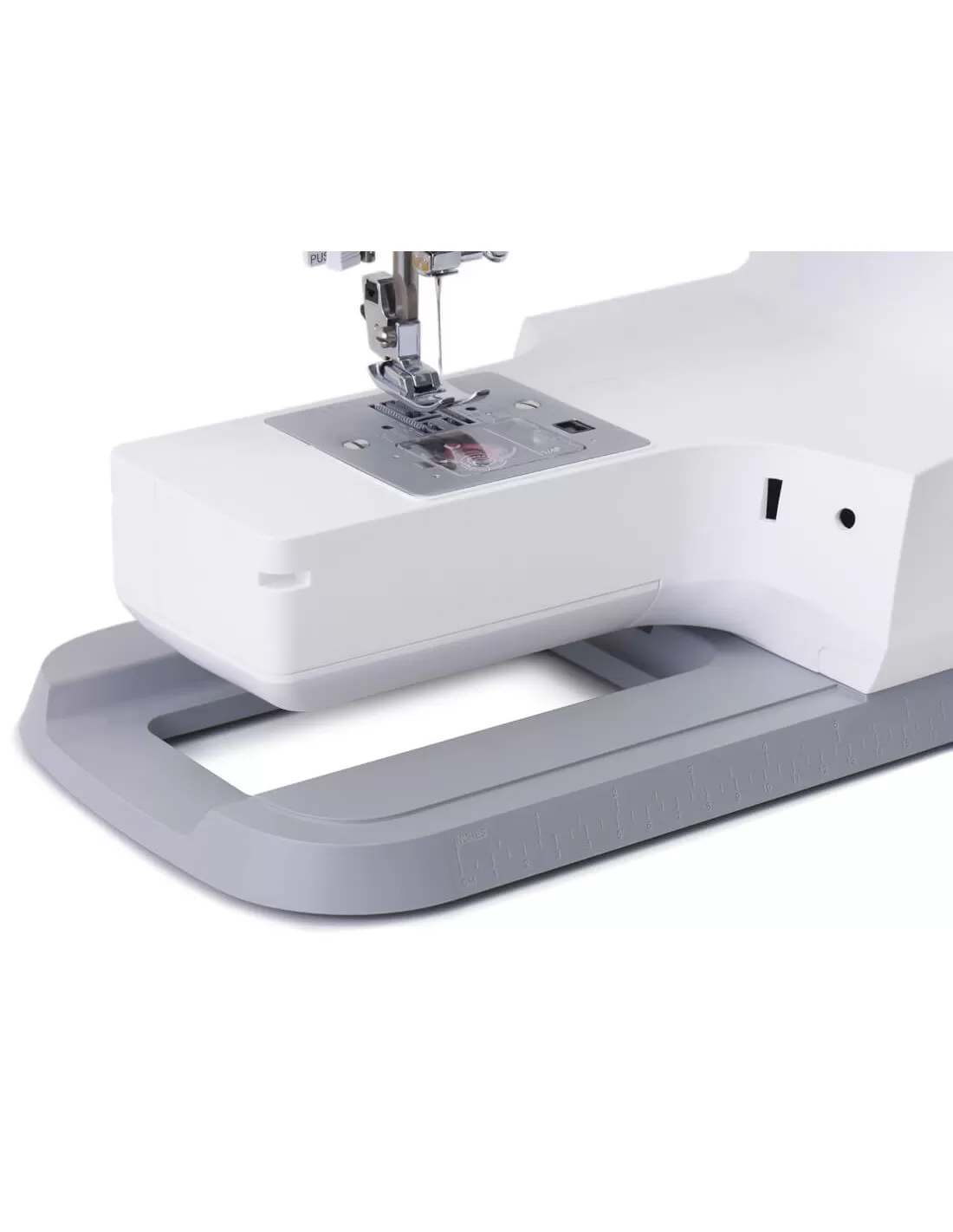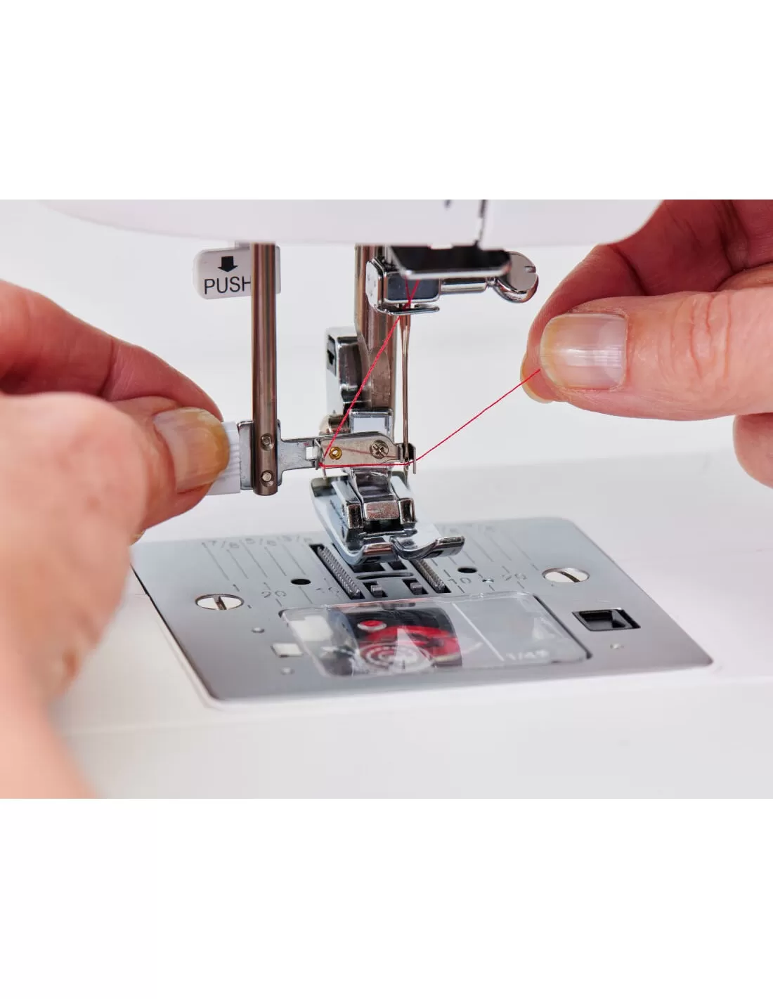 La máquina cuenta con un ojal automático de un solo paso, guías de enhebrado fáciles de seguir e iluminación LED brillante que garantizan un inicio rápido y acabados perfectos.