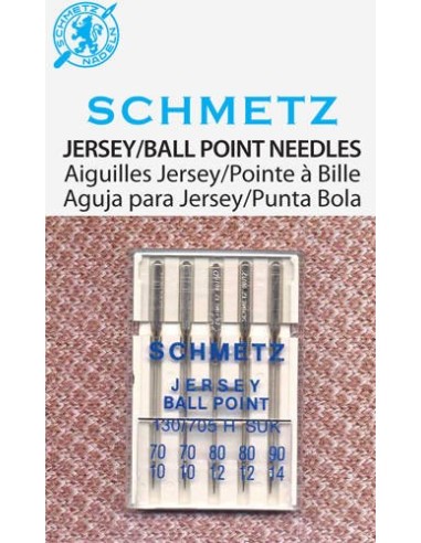 Les aiguilles Scmhetz Jersey pour machines à coudre ont la pointe de boule moyenne qui permet une couture parfaite sur les tissus tricotés, corseterie, sweatshirts, gaze, jersey, lycra.