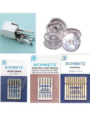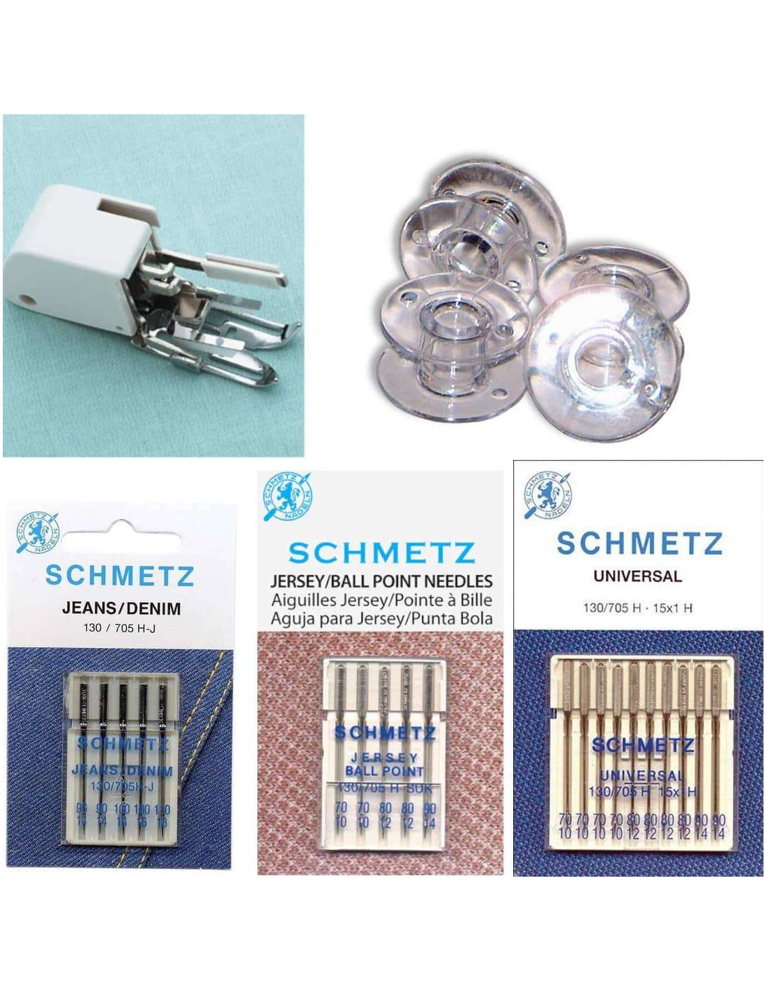 Ce kit de couture de machine avancé comprend un pied à double port, un paquet d’aiguilles de 70 à 100, un pour le tissu Jeans, un pour les tissus Jersey et 10 spolines.