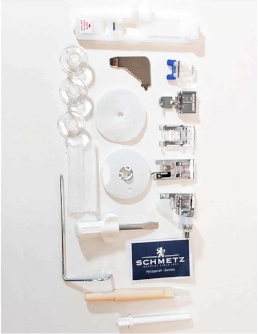 La large gamme de pieds comprend le pied pour broderie/reprise, le pied de cordage, pied de bouton, pied de fermeture éclair, etc. qui peut être rangé dans un compartiment pratique réservé exclusivement à ces accessoires.
