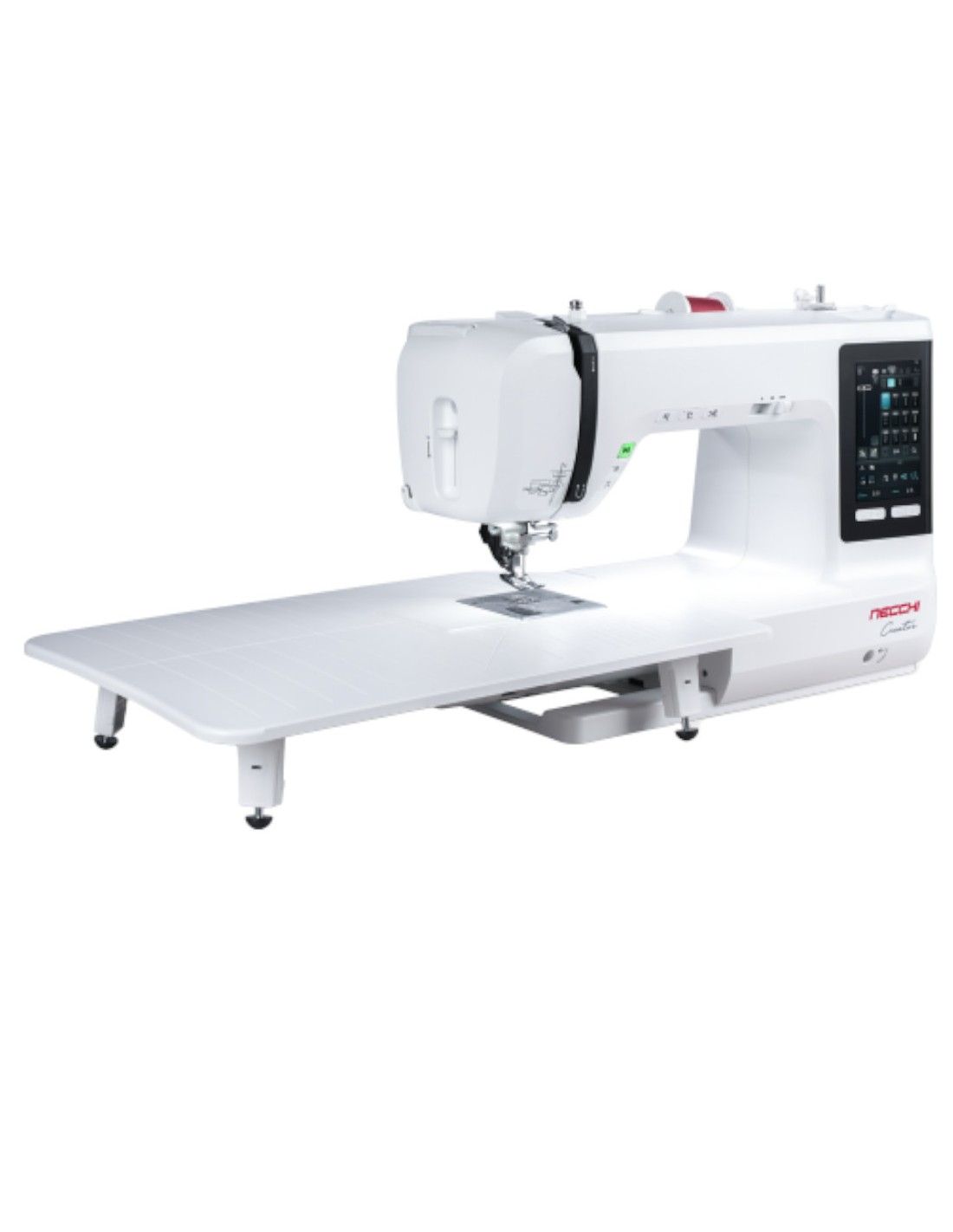 Parmi les accessoires, il y a aussi la genouillère pour relever le pied-de-biche sans utiliser les mains et la table d'extension de base pour étendre la zone de travail déjà très large.Le bras long avec ses 23 cm à droite de l'aiguille garantit un espace de travail confortable même pour les travaux les plus fastidieux.
