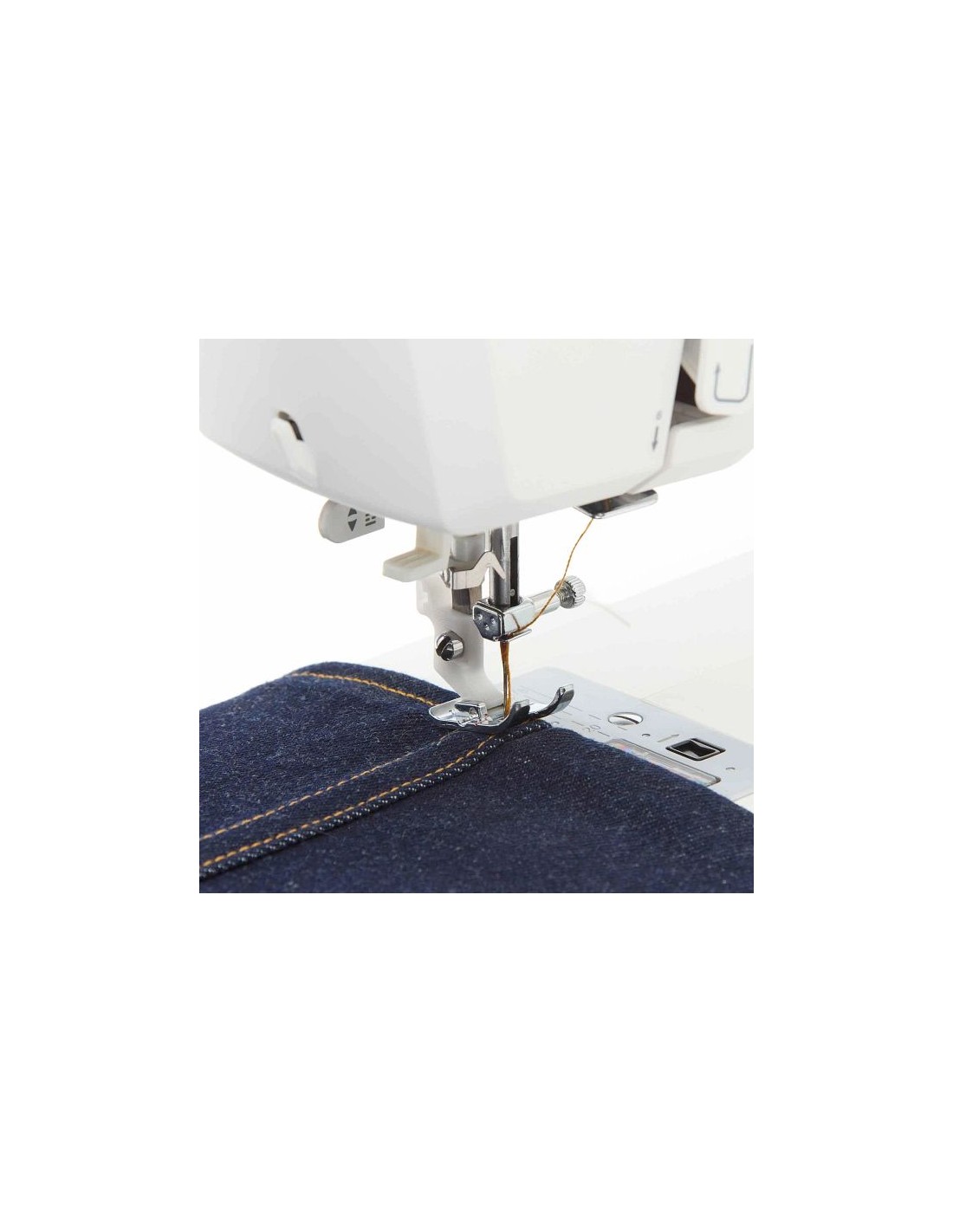 15 positions d’aiguille, tension du fil et pression du pied-de-biche réglables, bouton de marche arrière automatique, couture miroir, arrêt automatique, extension de point satin, éclairage LED, annulation de l’enfilage et 20 accessoires inclus.