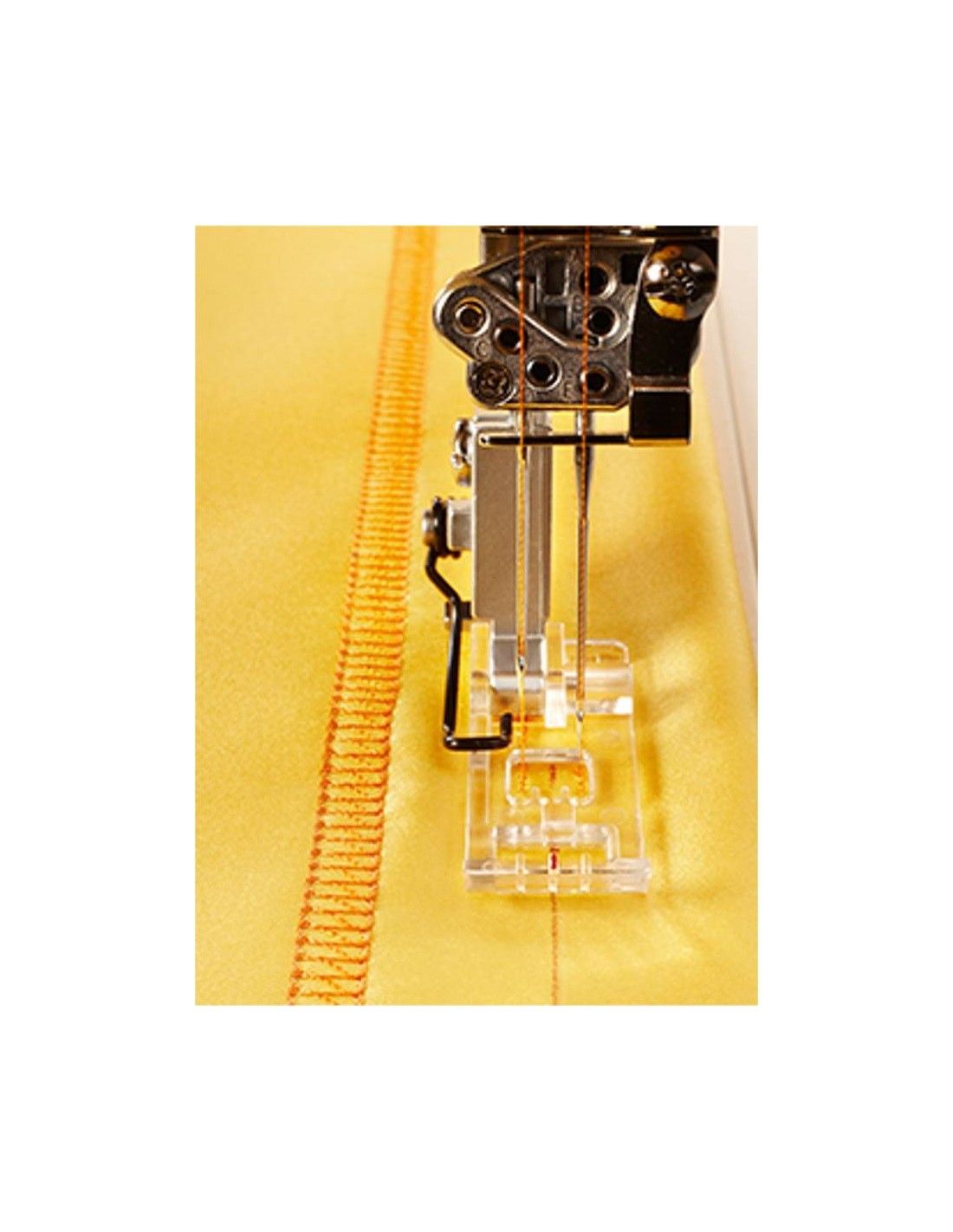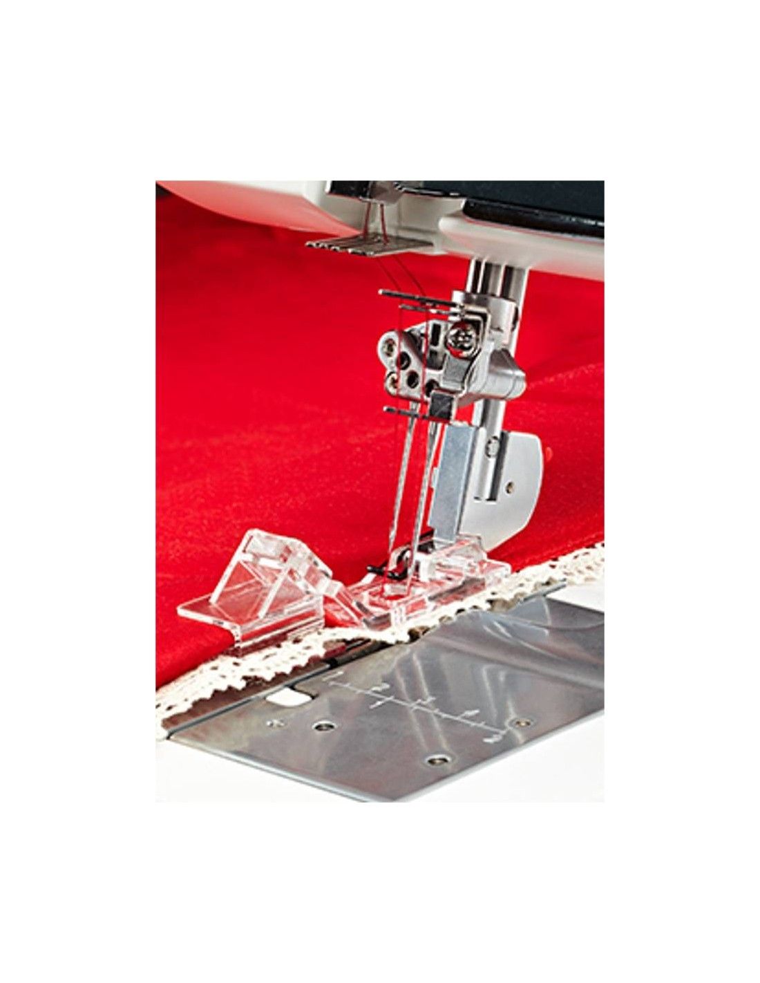 Ce Singerspécial, Pfaff, Husqvarna kit point de couverture comprend 5 pieds qui vous permettra d’augmenter la visibilité tout en cousant avec le pied transparent, créer des bords décoratifs et des effets fabuleux avec le pied pour joindre et plier les bords et avec cela pour la dentelle à marge plate.