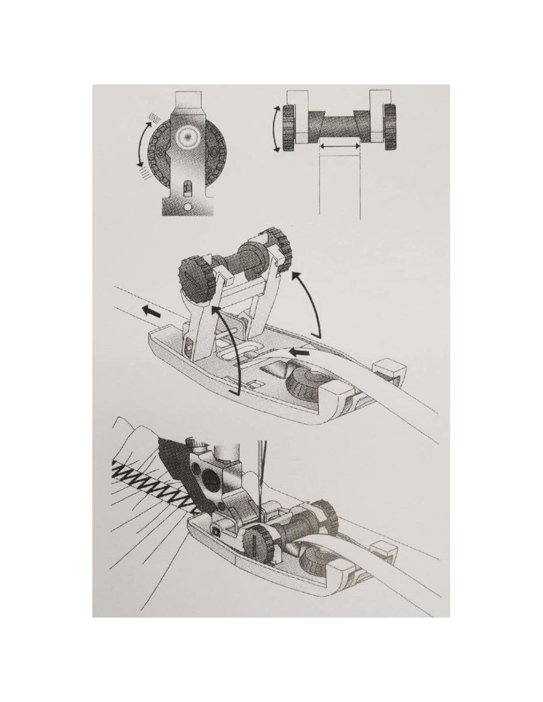 Placez l’élastique sur la machine à coudre Pfaff. Réglez la machine pour un point en zigzag mieux si plusieurs. Ajuste la largeur du point en fonction de la largeur de l’élastique et de la longueur du point en fonction de la qualité de l’élastique et de la quantité de collecte requise.