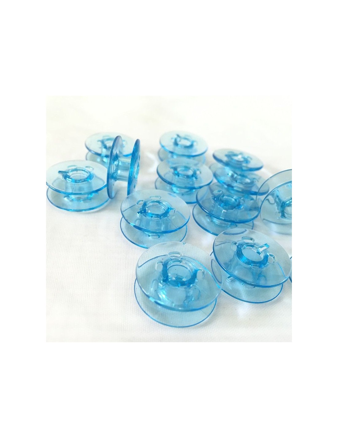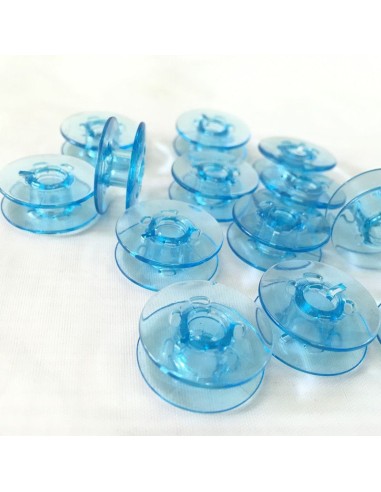 Confezione da 10 spoline in plastica trasparente azzurra, compatibili con le macchine da cucire Pfaff con crochet rotativo verticale.