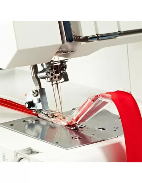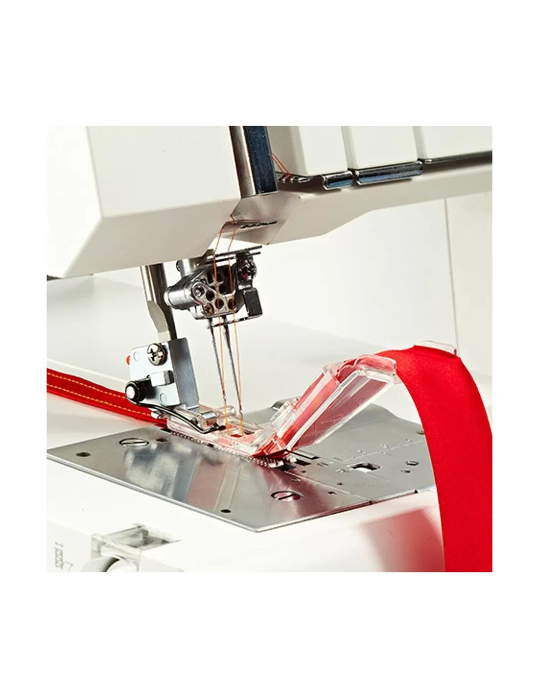 Con questo speciale accessorio devi solo inserire una striscia di tessuto nel piedino per piegarla e cucirla in maniera perfetta.