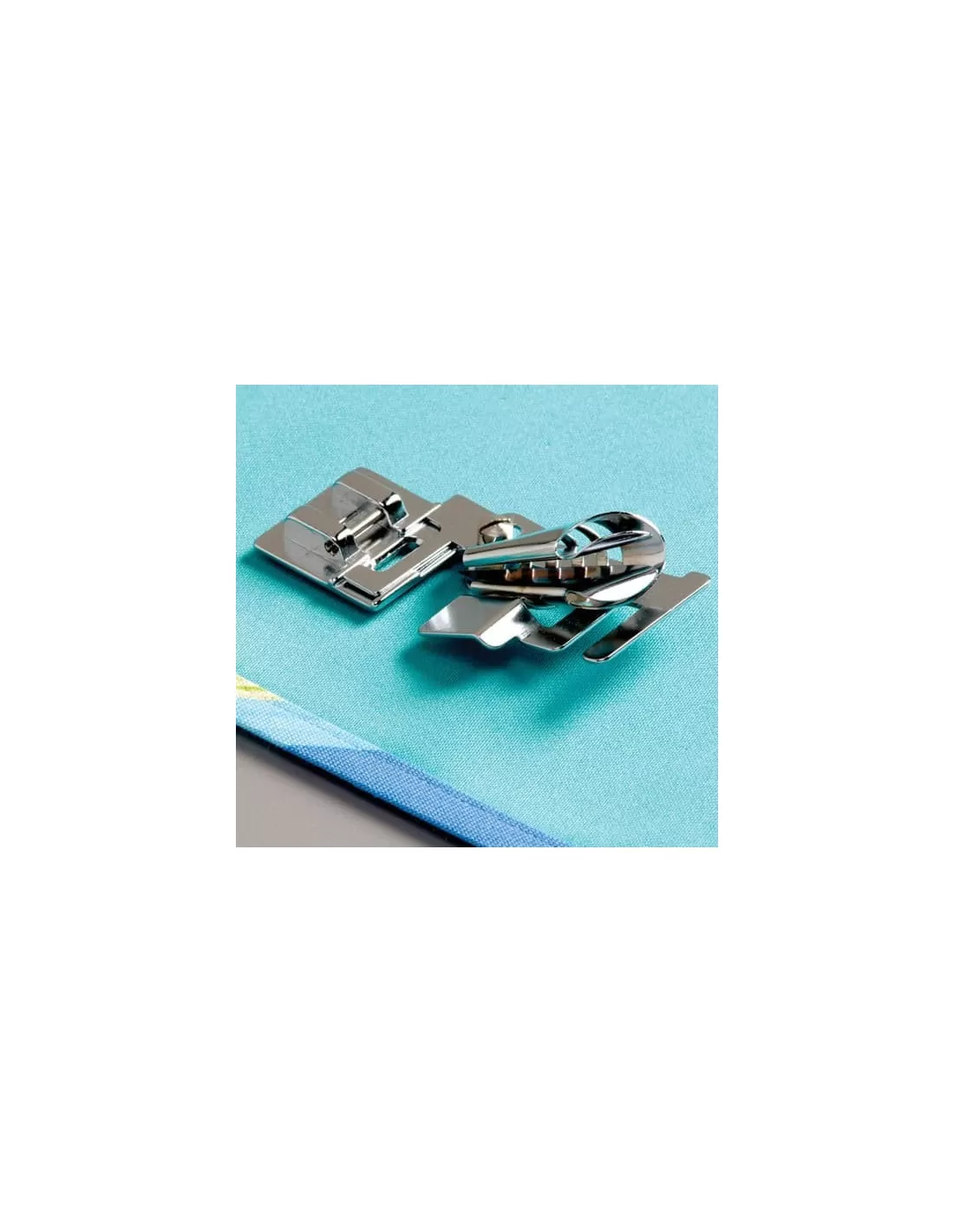 Questo piedino bordatore per macchine da cucire permette di applicare una striscia di tessuto sul bordo della stoffa risvoltando nel contempo i bordi della striscia in modo da ottenere un bordo rifinito con una sola cucitura.