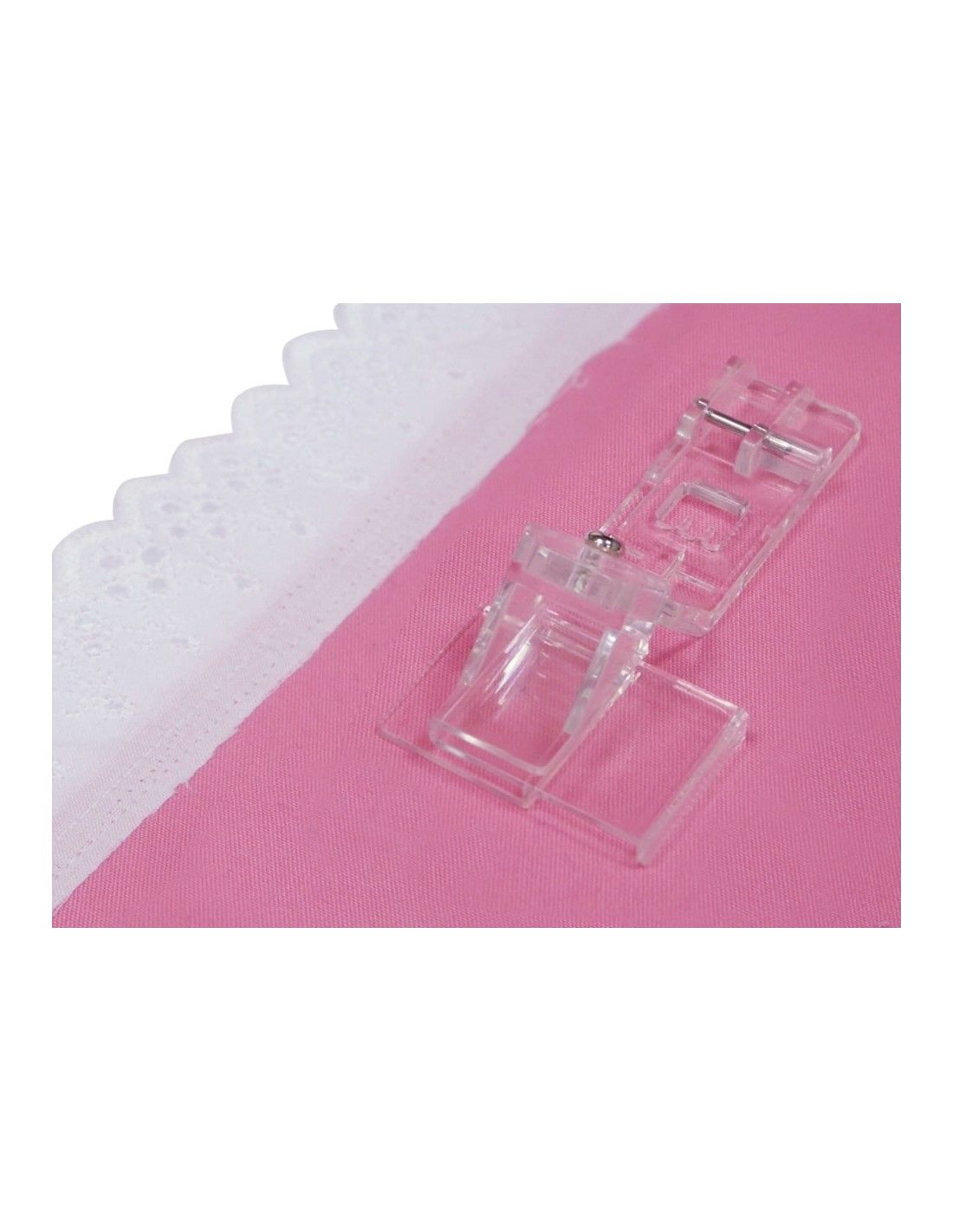 Utilizza il piedino trasparente per aumentare la visibilità mentre cuci, creare bordi decorativi ed effetti favolosi con il piedino per unire e ripiegare bordi e con quello per pizzi con margine piatto.
